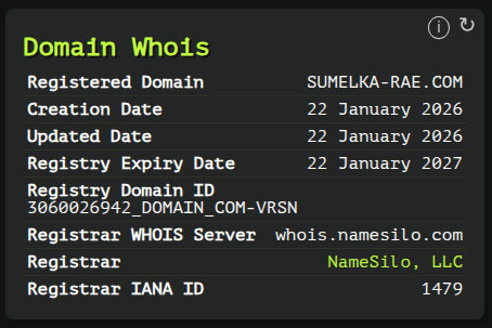 Aber: Die Absenderadresse der E-Mail endet auf @sumelka-rae.net. Die in der Signatur verlinkte Webseite aber auf sumelka-rae.com. Hier stimmt etwas nicht. Ich überprüfe die Domains und stelle fest, dass beide erst im Januar 2026 bei einem US-Registrar aus Arizona, der für besonders günstige Domainpreise bekannt ist, registriert worden sind.