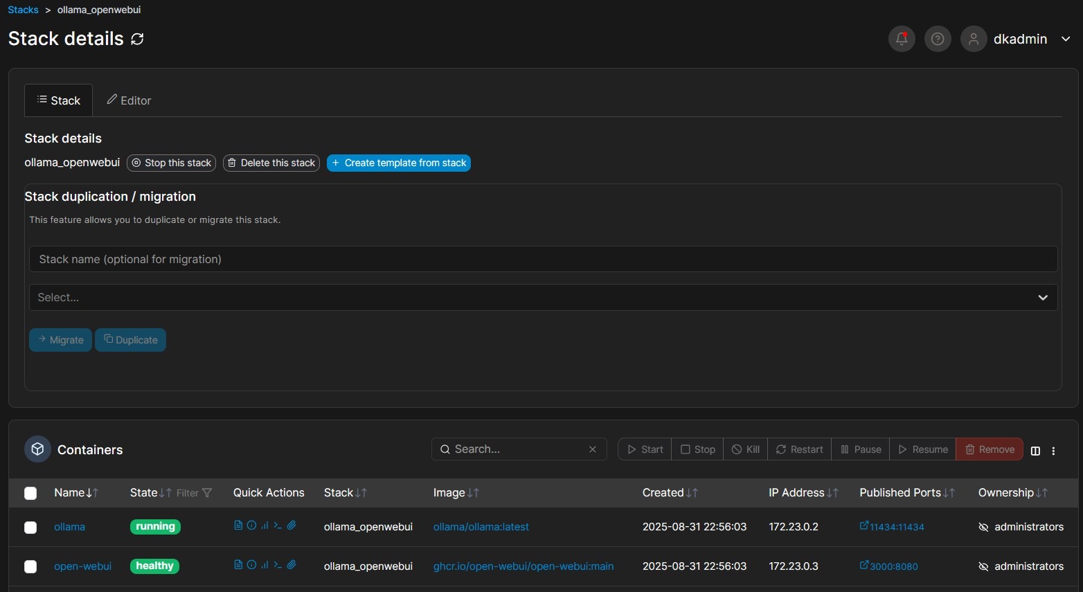War das Deployment erfolgreich, werden die Container automatisch gestartet und sollten in der Übersicht nun als ollama und open_webui als laufende Container sichtbar sein.