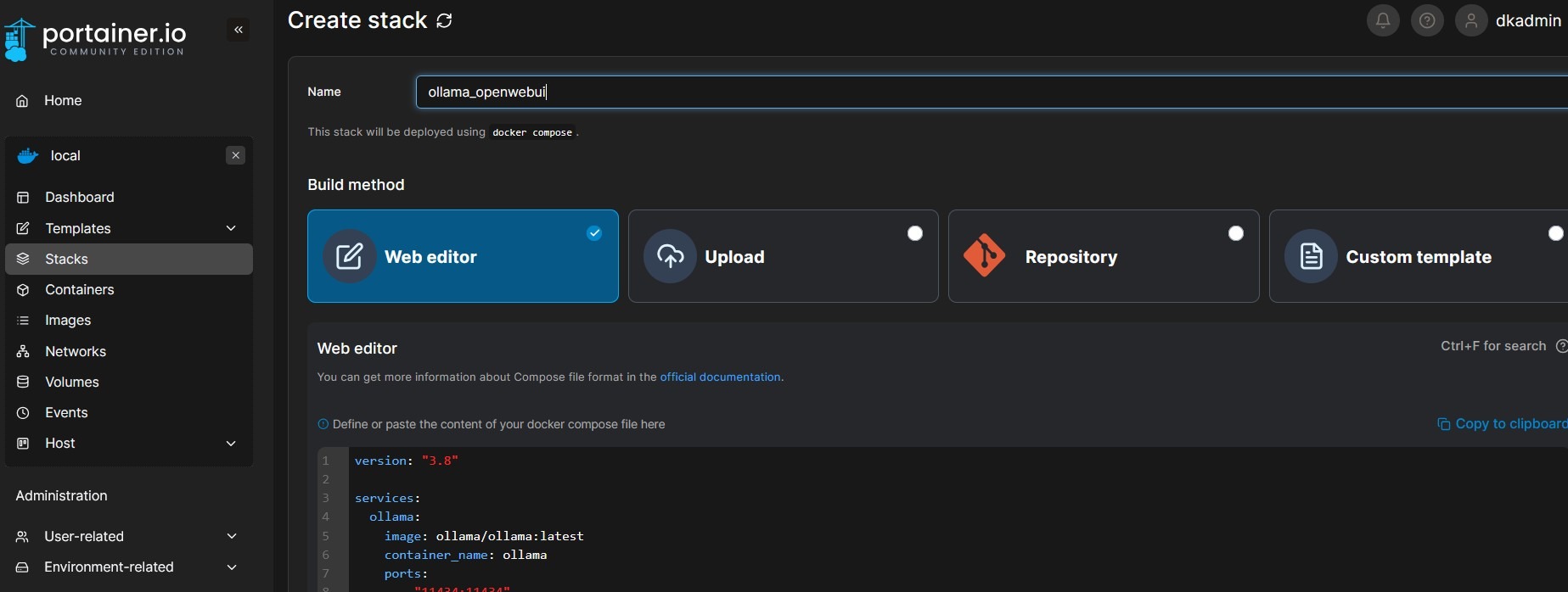 Nach dem Login in Portainer (oder alternativ in der Docker-App von UGOS) lege ich einen neuen Stack an. In UGOS heißt die Funktion „Projekt“. Diesem Stack gebe ich einen passenden Namen, etwa ollama_openwebui