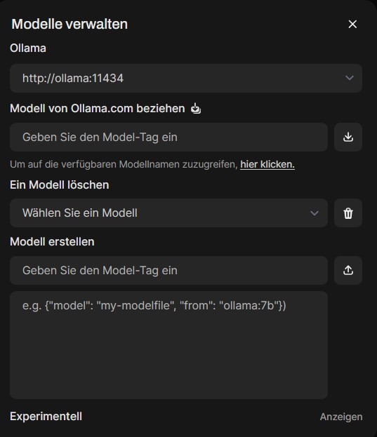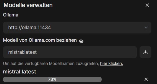 Nun gilt es, ein Sprachmodell von Ollama zu beziehen. Dazu muss da exakte Model-Tag eingegeben werden. Ein Link zur Übersicht aller verfügbaren Modelle findet sich direkt in der Oberfläche untere dem Eingabefeld oder online unter ollama.com/library. Für meinen ersten Test habe ich mistral:latest verwendet.