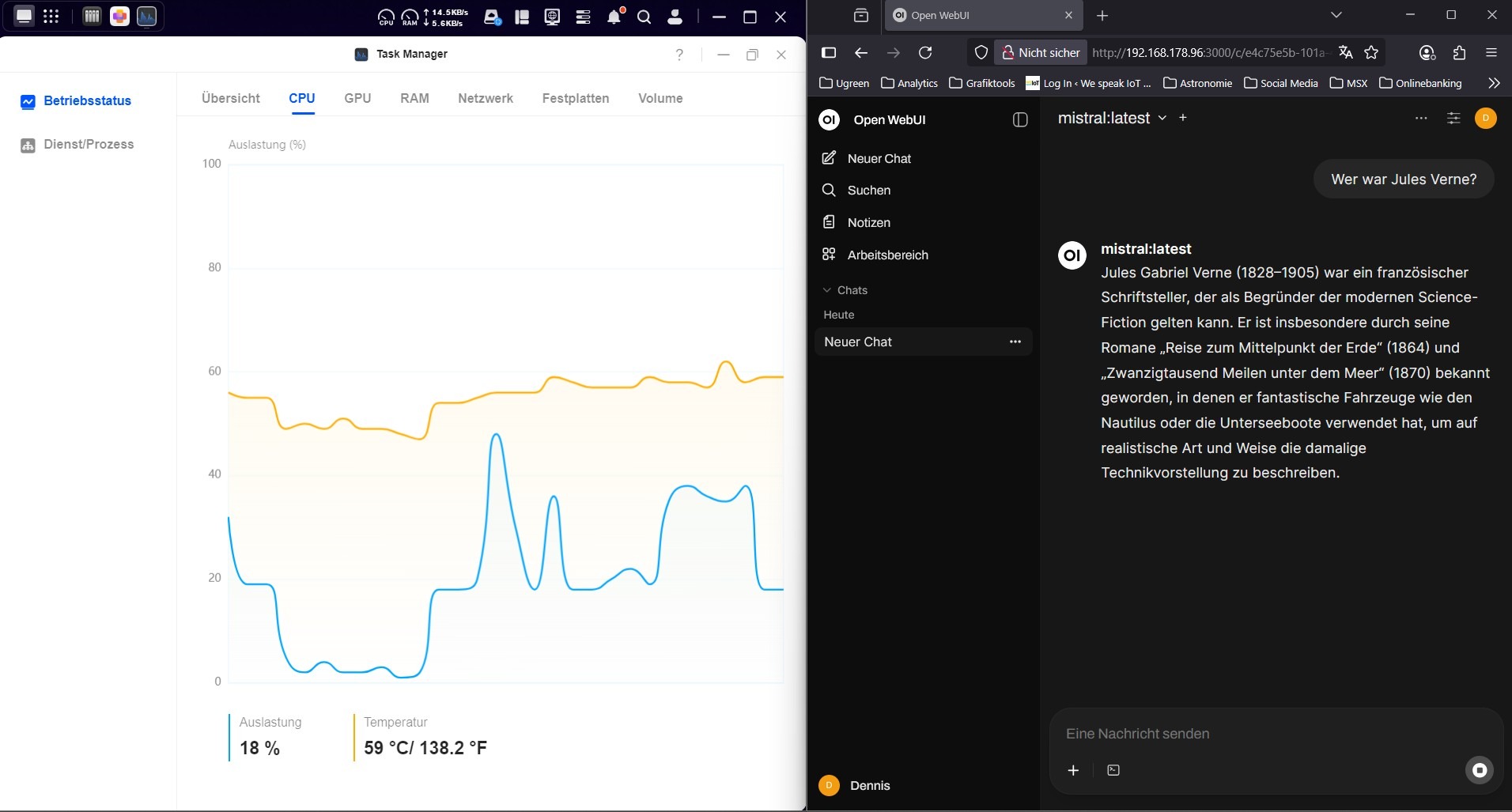 Sobald das erste Modell installiert ist, kann man direkt mit Anfragen loslegen. In meinem Fall habe ich eine kleine Testfrage zu Jules Verne gestellt. Das NAS hat diese Aufgabe gemeistert, ohne gleich in die Knie zu gehen – die CPU-Auslastung war allerdings deutlich sichtbar.