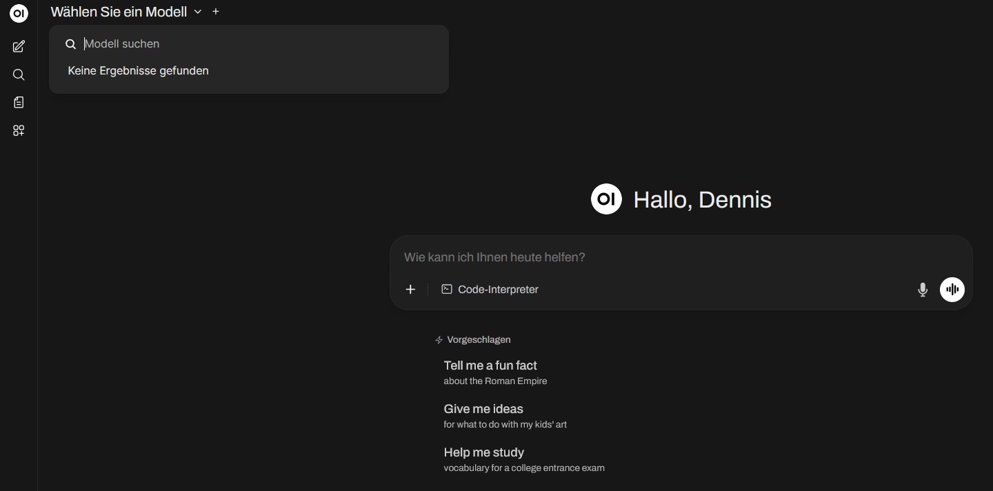 Nach dem Login präsentiert sich die Oberfläche ähnlich wie von gängigen KI-Chatlösungen gewohnt. Allerdings ist noch kein Sprachmodell installiert – ohne das geht natürlich nichts.