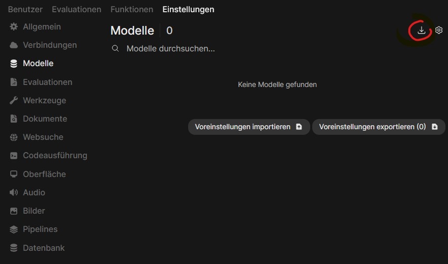 Den Menüpunkt zum Herunterladen und Verwalten der Sprachmodelle findet sich dann wieder leicht versteckt oben rechts (hier rot eingekreist).