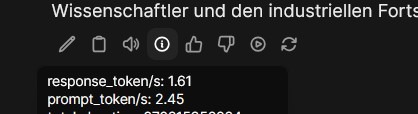Mit OpenWebUI erscheinen unter jeder Antwort kleine Icons, darunter ein Informations-Icon, ein eingekreistes „i“. Dort lassen sich zu jeder Antwort die Token/S ablesen. Mein NAS schaffte hier mit Mistral rund 1,5 Antwort-Token pro Sekunde und rund 2,5 Prompt-Token pro Sekunde. Mit DeepSeek R1 waren es zumindest 4,4 Antwort-Token/s und mit phi3 rund 2,7 Token/s, moondream kam auf 5,8 Token/s.